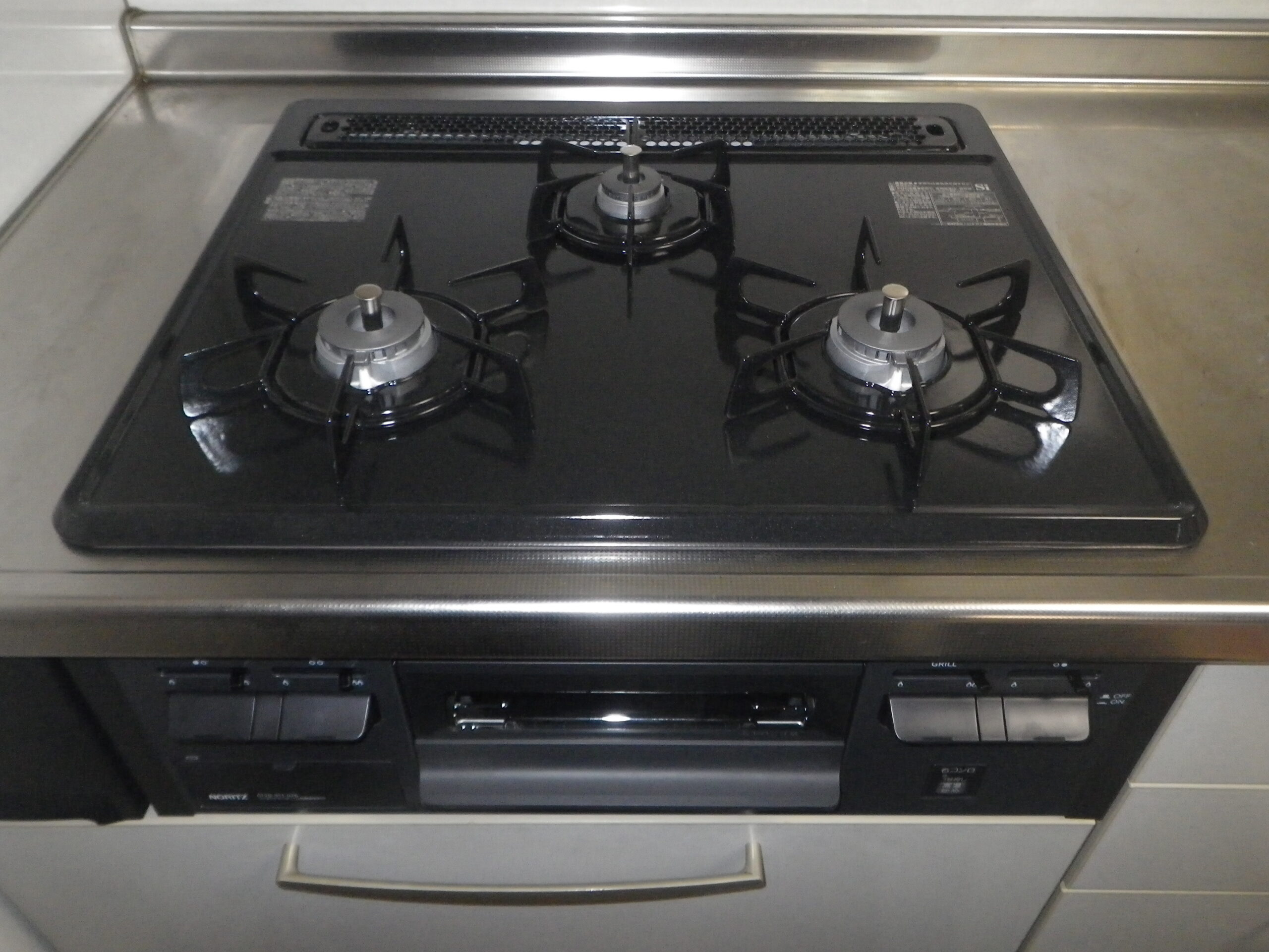 ノーリツ 3口 ビルトインコンロ メタルトップ ( N3GT2RVQ1 ) へ取付工事後の写真です。