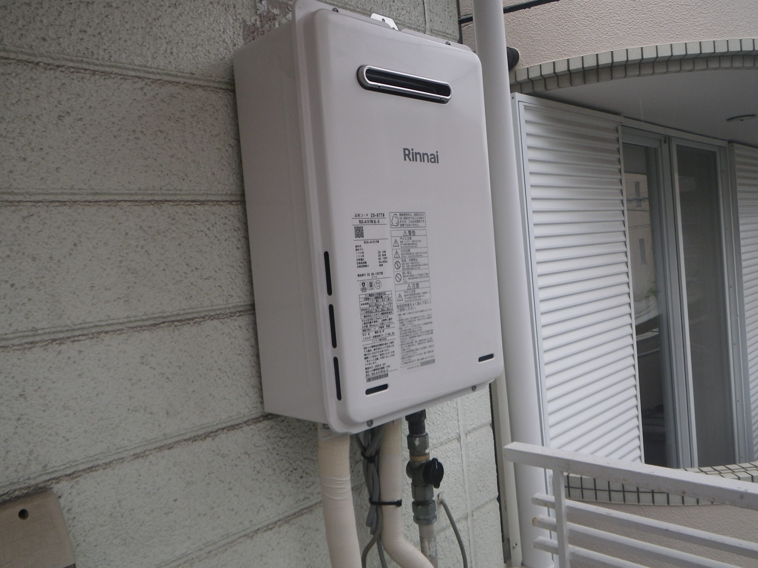 リンナイ 10号 ガス給湯器 標準設置形( RUX-A1015W(A)-E )へ取替工事の写真です。