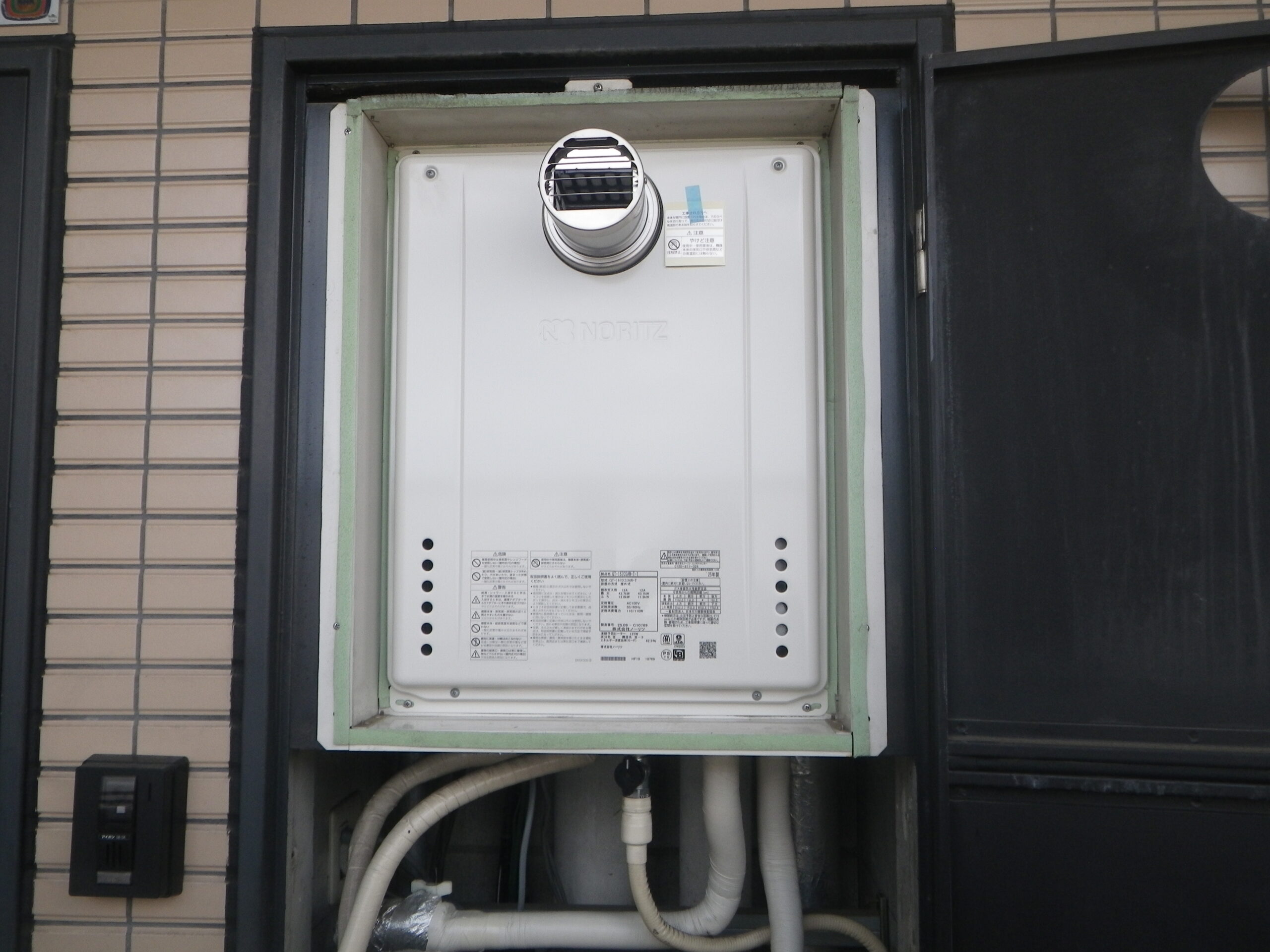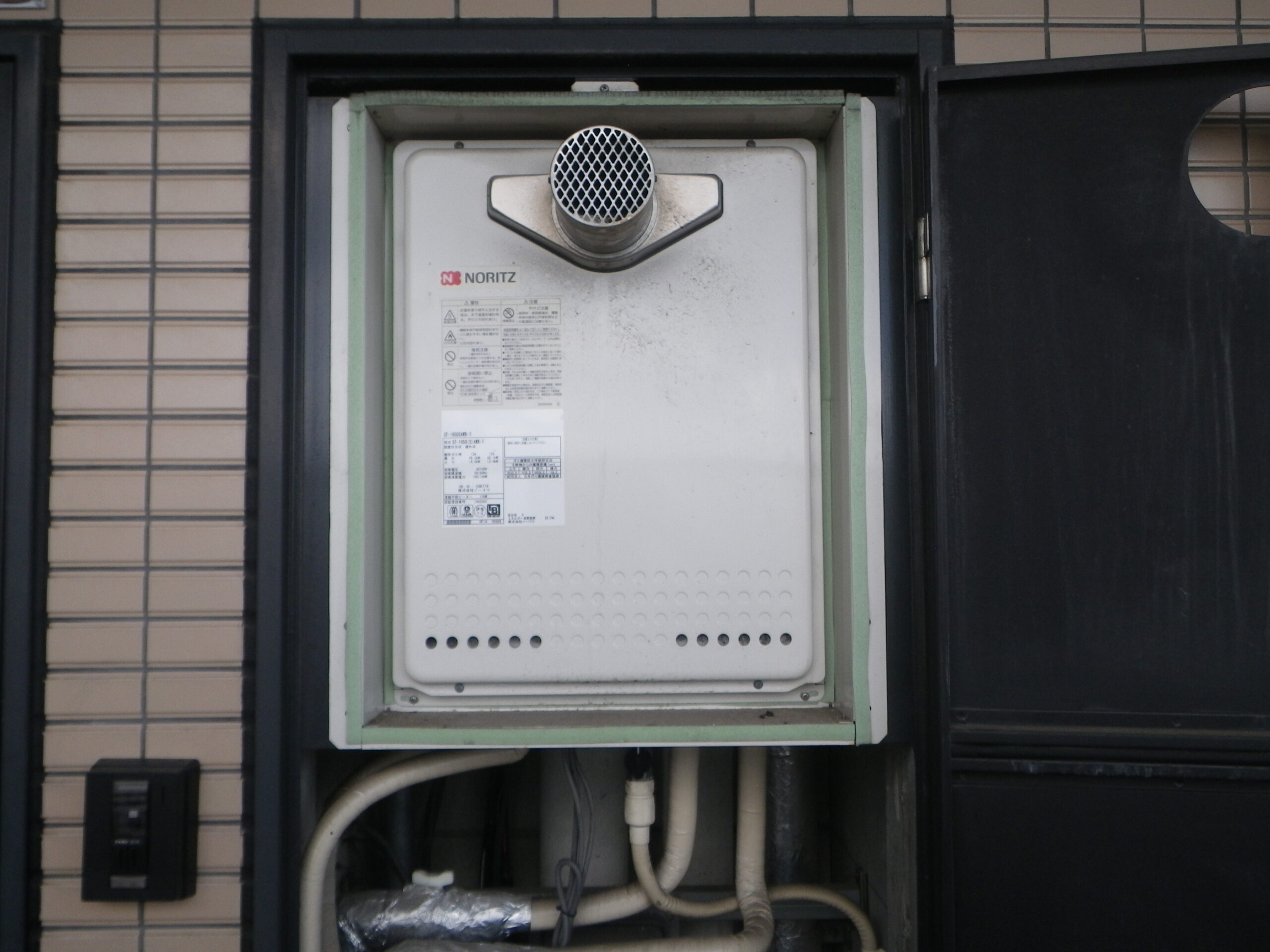 ノーリツ 16号 ガスふろ給湯器 PS扉内設置 セミオート ( GT-1670SAW-T BL ) へ取替工事の写真です。