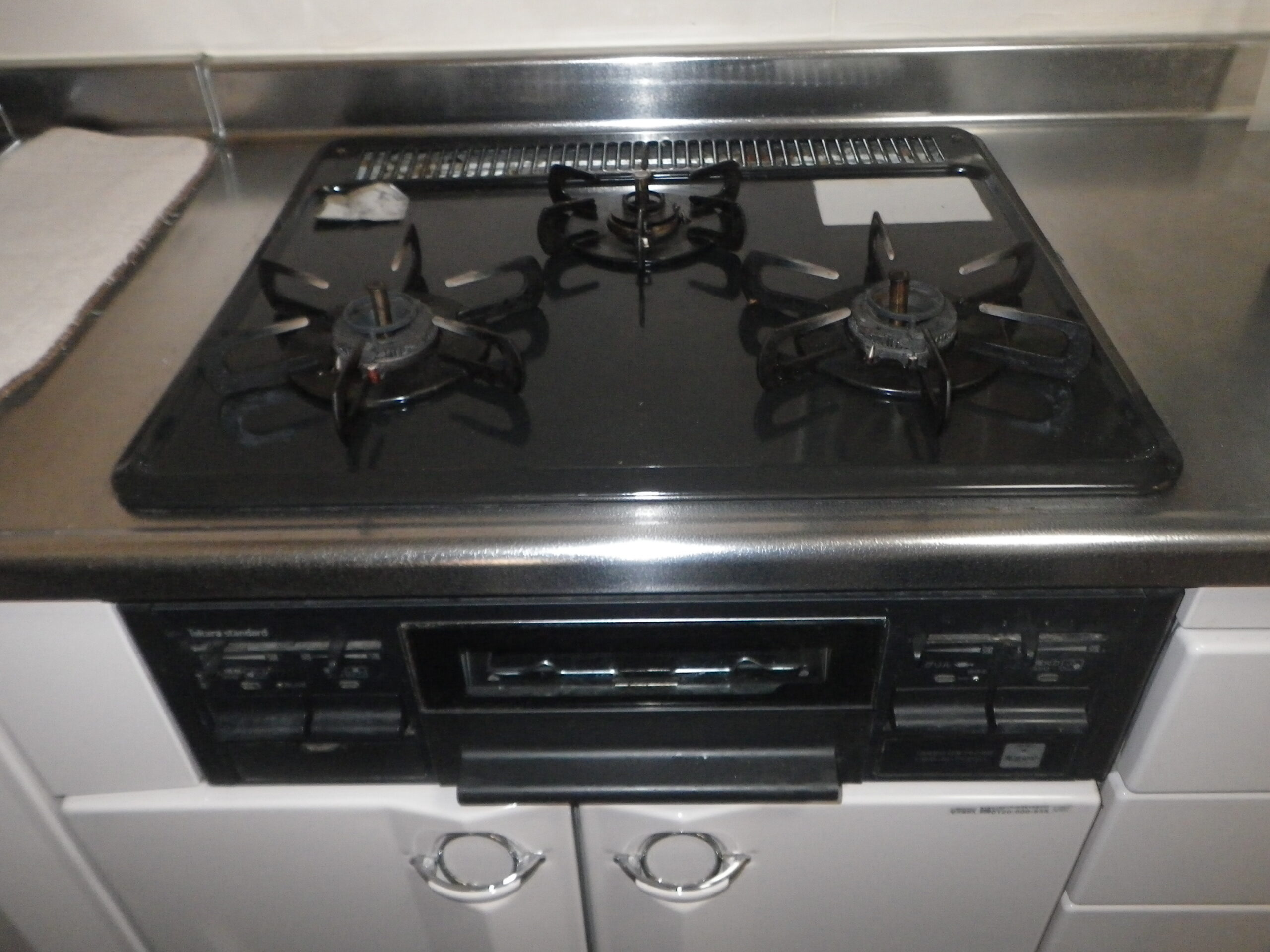 タカラ 3口 ガス ビルトインコンロ ( T33-10R ) から ノーリツ 3口 ガス ビルトインコンロ メタルトップ( N3GT2RVQ1 ) へ取替工事をさせて頂きました。