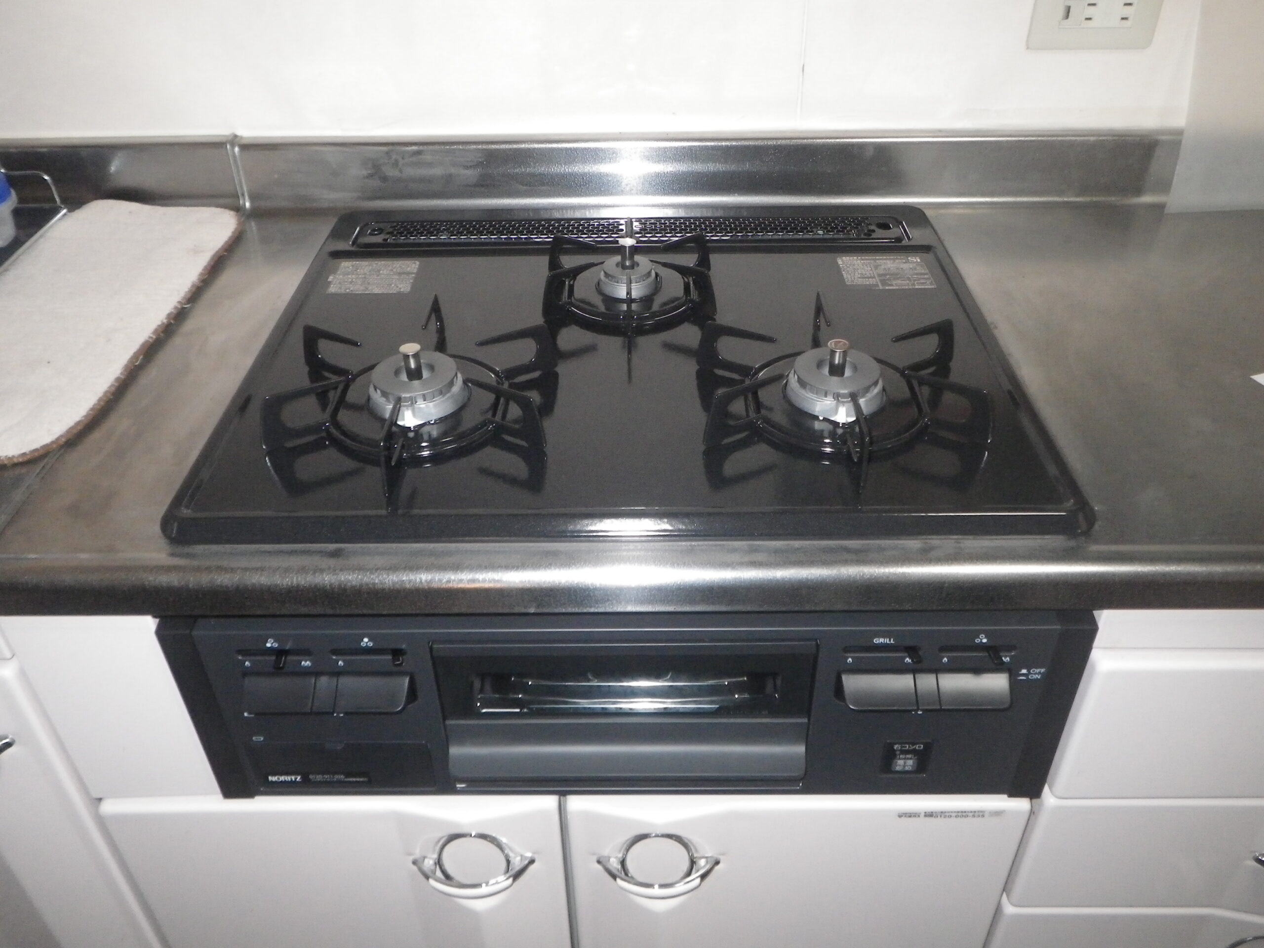 ノーリツ 3口 ビルトインコンロ メタルトップ ( N3GT2RVQ1 ) へ取付工事後の写真です。