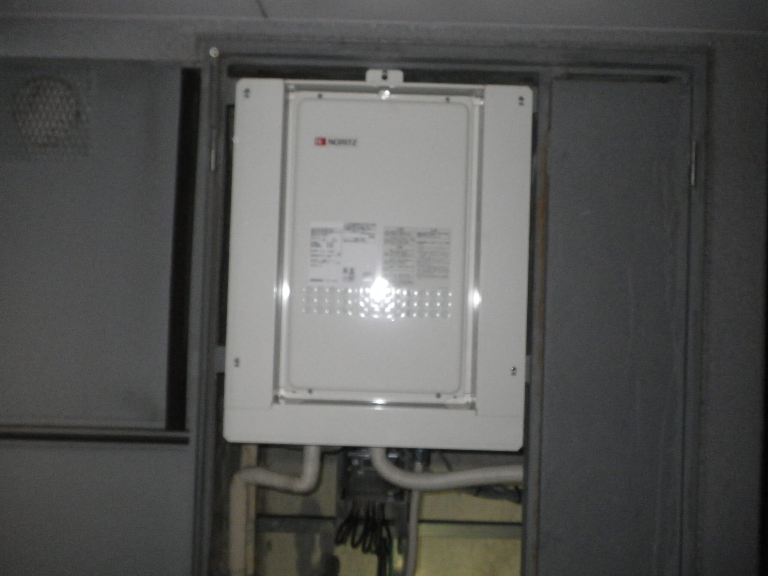 ノーリツ 16号 ガス給湯器 高温水供給式 PS扉内設置形 後方排気( GQ-1627AWX-TB-DX BL ) へ取替工事の写真です。