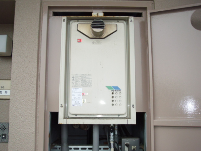ノーリツ ガス給湯器 高温差し湯タイプ 扉内設置型 前方排気 (GQ-1620AW-T) から リンナイ ガス給湯器 高温水供給式 メーターボックス設置形 前方排気 (RUJ-V1611T(A)) へ取替工事をさせて頂きました。