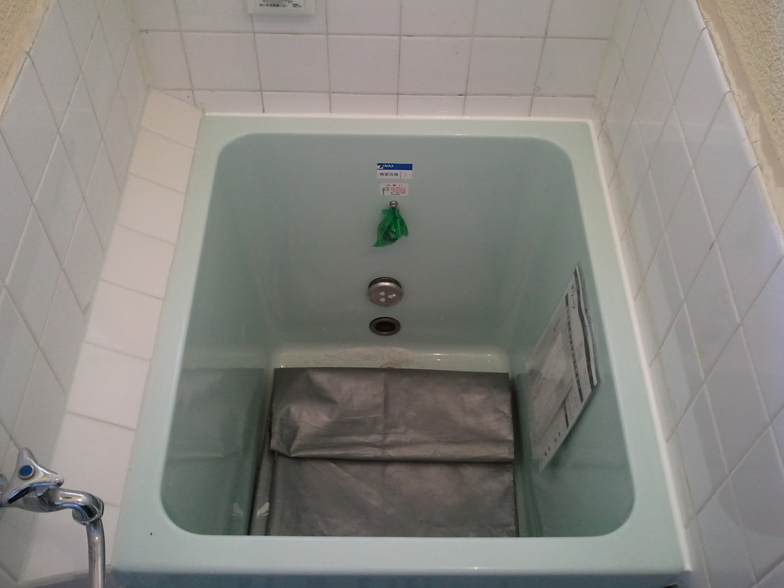 ポリ浴槽はタイルで囲まれていて、浴室のドアの寸法より大きい為、浴室内でサンダーで切り小さくして、浴室から取り出しました。