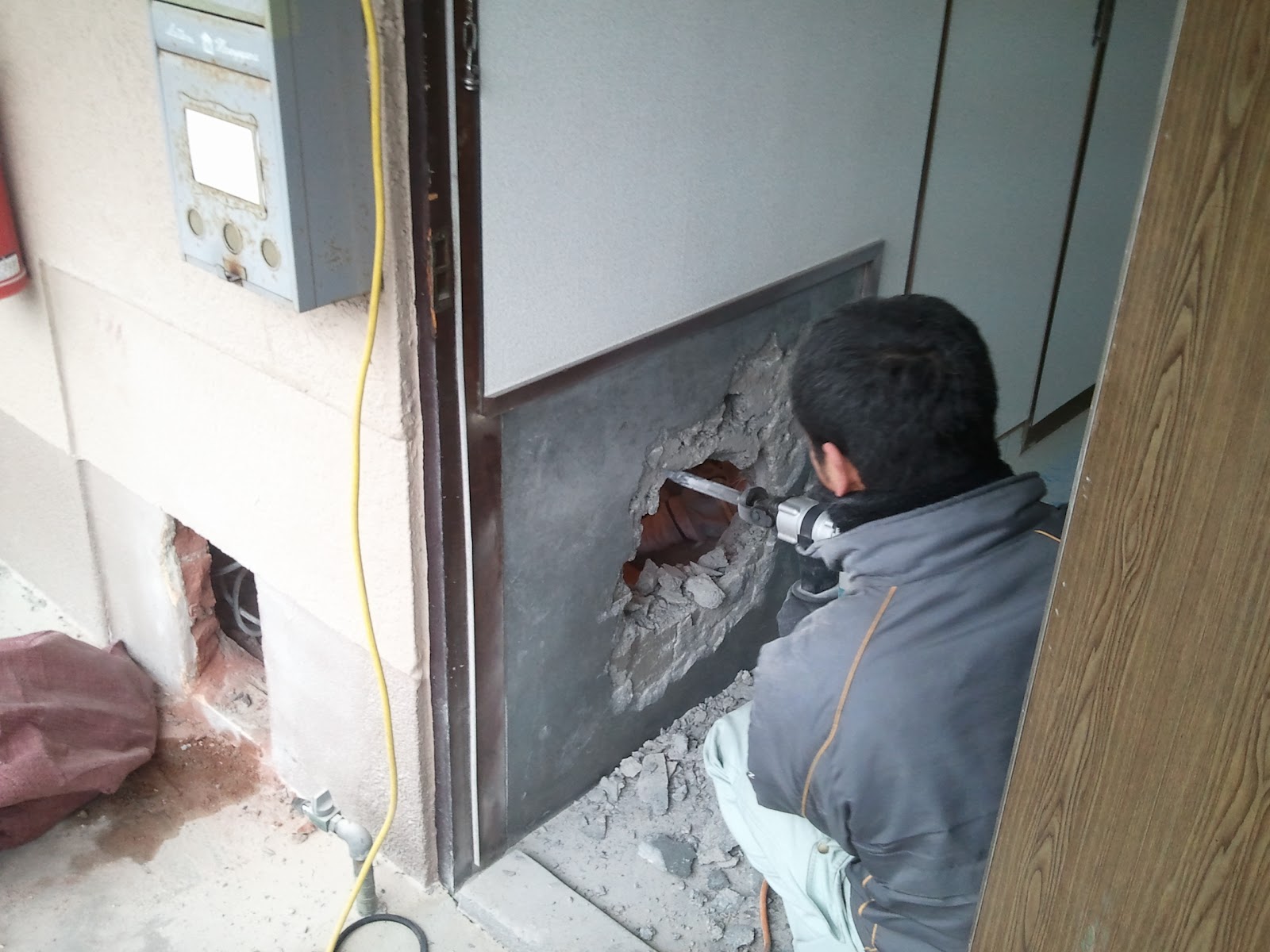新しい浴槽を入れる為、玄関横の壁をはつっています。