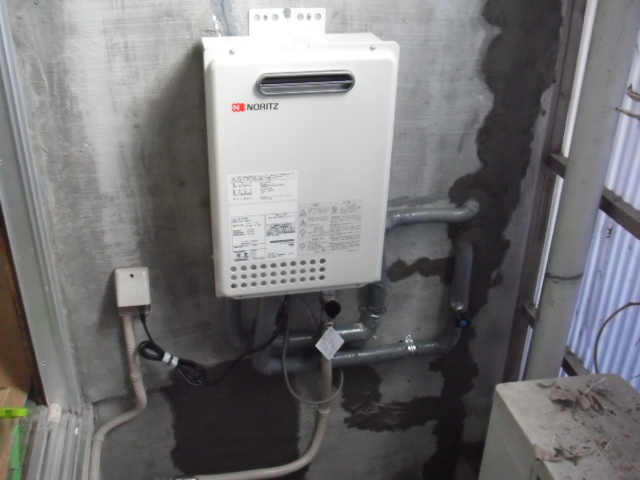 ノーリツ ガス給湯器 屋外設置 ( GQ-1637WS ) と イナックス 2ハンドルシャワー水栓 の取替工事後の写真です。