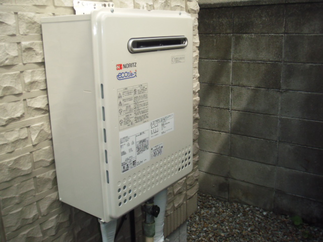 ノーリツ 24号 エコジョーズ ガス風呂給湯器 屋外設置型 セミオート (GT-C2452SAWXーBL)への取替工事後の写真です。