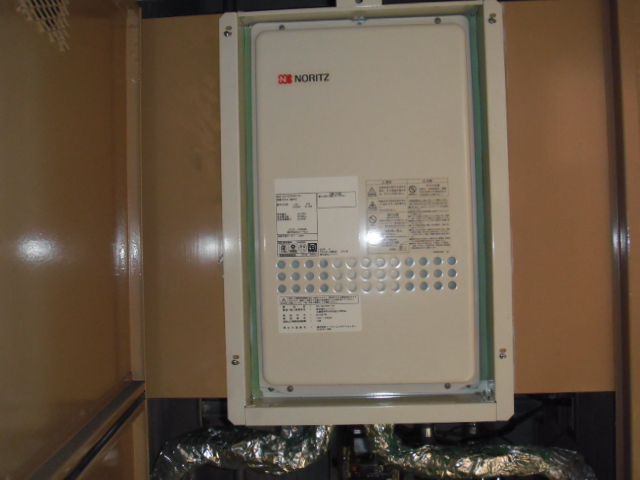 ノーリツ ガス給湯器 高温水供給方式 扉内設置形 後方排気 ( GQ-1627AWX-TB )へ取替工事の写真です。