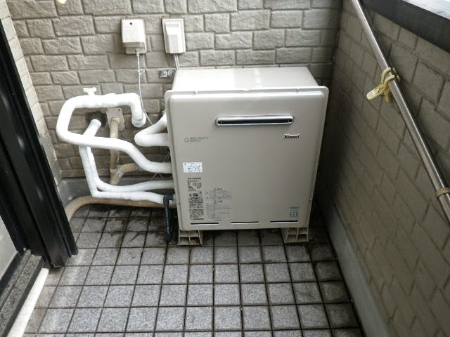 リンナイ 24号 エコジョーズ ガス風呂給湯器 屋外据置設置形 ( RUF-E2405AG )へ取替工事の写真です。