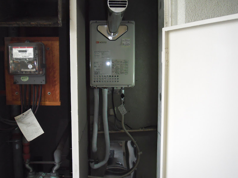 既設パロマ製給湯器据え置き型を撤去して、正面の壁にノーリツ製ガス給湯器を吊りました。