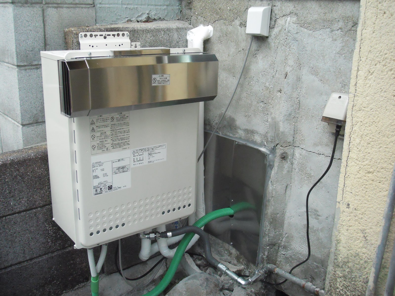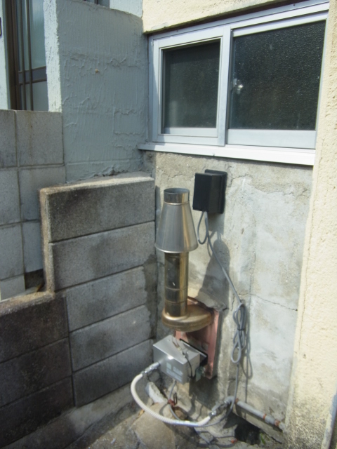 浴室面の外壁ががたがたでしたので、左のブロックに追炊き付き給湯器(GT-1650SAWX-2 BL)を取り付け提案をさせて頂きました。