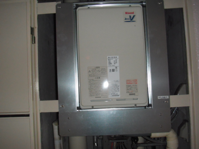 リンナイ ガス給湯器 高温水供給式 ハイフロー PS設置形 後方排気 ( RUJ-V1611B (A) ) へ取替工事の写真です。