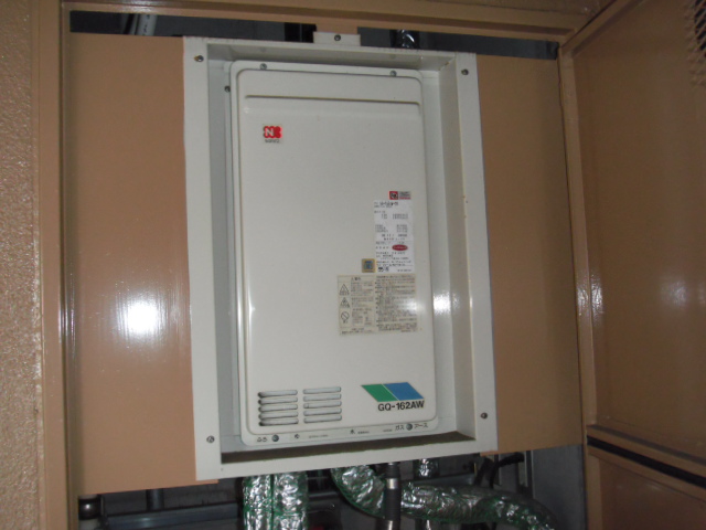 ノーリツ 16号 ガス給湯器 高温水供給方式 扉内設置 後方排気 ( GQ-162AW-TB ) から ノーリツ 16号 ガス給湯器 ジェットフロー 高温水供給方式 PS扉内設置形 後方排気 ( GQ-1627AWX-TB ) へ取替工事をさせて頂きました。